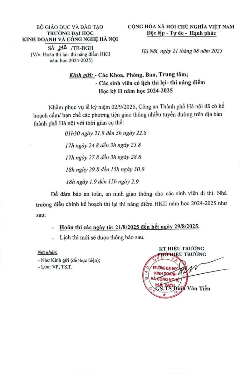Thông báo: LỊCH THI LẠI, THI NÂNG ĐIỂM CÁC HỌC PHẦN CUỐI HỌC KỲ 2 NĂM HỌC 2024-2025 VÀ THI LẠI CÁC LỚP HỌC LẠI ĐỢT THÁNG 04/2025 kèm theo công văn số 124/TB-QLĐT ngày 16/08/2025